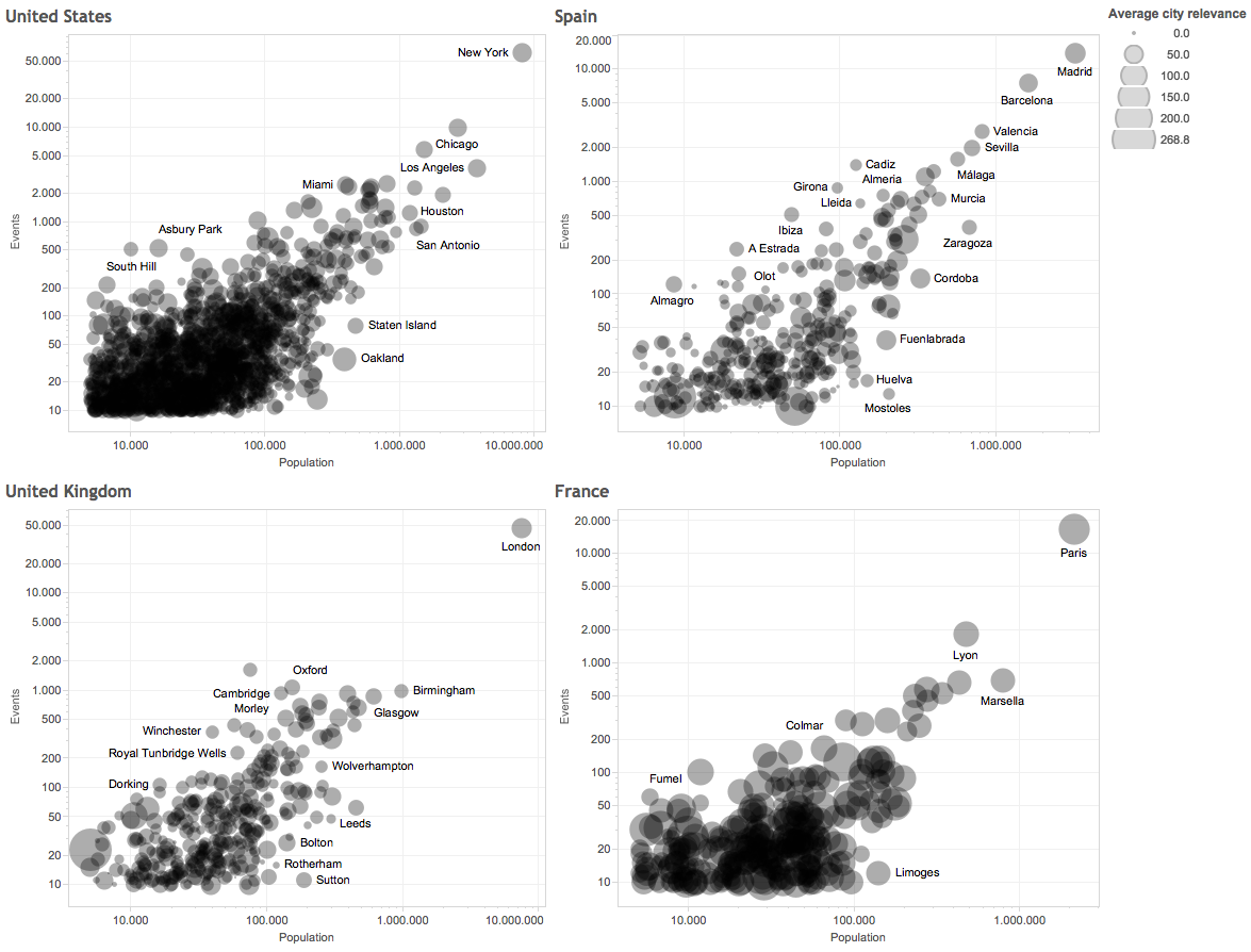 Figure 4: Cities events correlated with populations for United States, Spain, United Kingdom and France, where cities sizes is defined by average relevance.